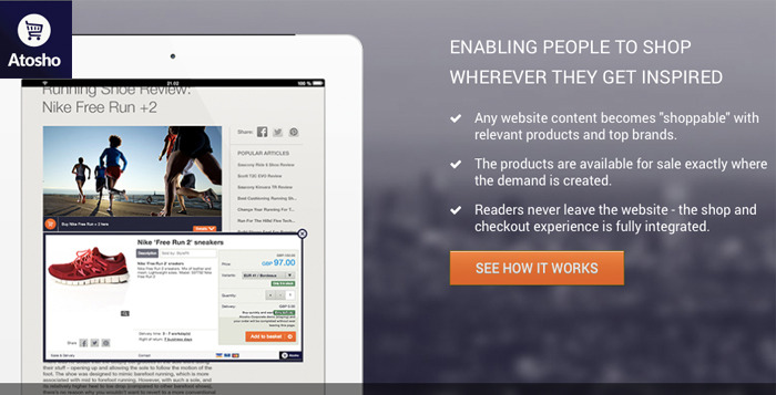 Atosho blev i 2011 en aktiv spiller indenfor e-commerce gennem deres innovative teknologi, der er et differentierbart alternativ til Amazon veletablerede markedsplads strategi. Atosho’s e-commerce platform fungerer i bund og grund som en markedsplads, blot uden et destinationssite, hvor brugeren normalt vil have deres loyalitet. Atosho modtager produktfeeds fra onlineforhandlere og placerer dem i produktkategorier og ved at identificere mediernes indhold, matcher Atosho det tilbud fra kataloget, der passer til den pågældende artikel. Markedspladsen tilpasses brugerens interesse, fremfor at brugerne skal søge hen på markedspladsen.