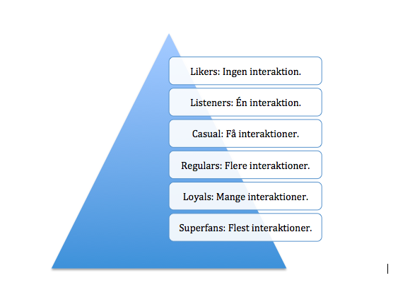 Fra listeners til superfans findes de brugere, der er mest engagerede i forhold til virksomheden. 60% er listeners, 30% er casuals, 6% er regulars, 3% er loyals og kun 1% er superfans. Carat har derfor forsøgt sig med kun at henvende sig til superfans, som resulterede i 3,61 flere klik.